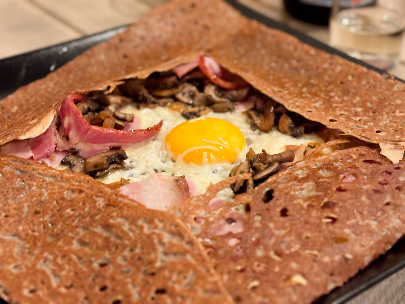 Œuf, Emmental, Chèvre, Bleu, Camembert, Jambon, Lard, Andouille, Saucisse grillée, Sardine, Champignons à la crème, Oignons confits au cidre, Pommes de terre sautées